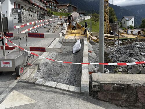 Auf der Bergstrasse (Hotel Oberland) wurde eine neue Fahrbahnhaltestelle gebaut. Um einen sicheren und barrierefreien Ein- und Ausstieg zu gewährleisten, musste eine auskragende Platte erstellt werden. Diese gründet auf mehreren Betonriegeln und wurde mit der bestehenden Mauer/Kordon verbunden.